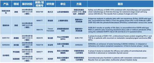2022 ASCO年会另有5款ag真人国际官网医药上市前抗肿瘤创新药的相关研究被接收为壁报,包括SHR-1316、普那布林、法米替尼、SHR-1701和SHR2554,他们的单药或联合方案相关7项研究被接收为壁报,覆盖肺癌、鼻咽癌、淋巴瘤、甲状腺癌和结直肠癌等领域。